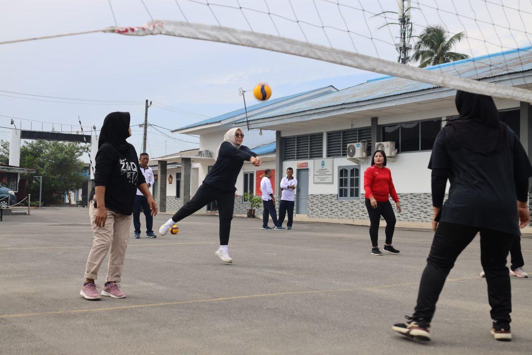Kegiatan olahraga bersama diawali dengan pemanasan untuk mengurangi cedera otot, dilanjutkan dengan permainan bola volley.