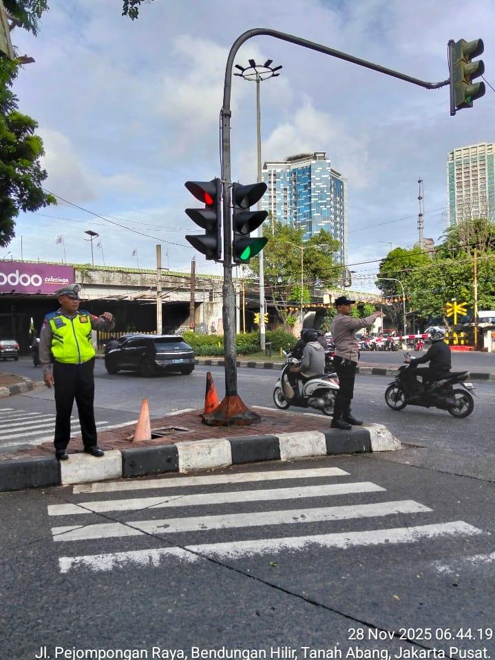 Jurnalsembilan.com Jakarta Pusat — Polsek Metro Tanah Abang bersama Lalu Lintas melakukan pengaturan lalu lintas secara langsung di TL. Pejompongan, Tanah Abang, Jakarta Pusat. Pada Jumat, 28 November 2025.