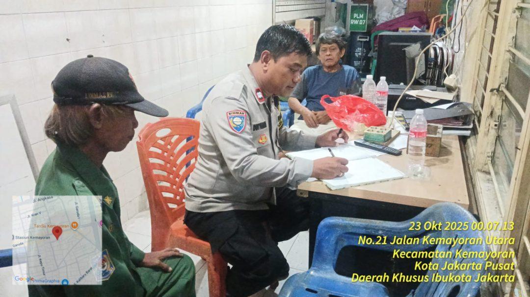 Jurnalsembilan.com.Jakarta Pusat — Dalam rangka memperkuat program Jaga Jakarta, Bhabinkamtibmas Kelurahan Kemayoran Aiptu Dwi Yulianto bersama anggota Pokdarkamtibmas melaksanakan patroli dini hari sekaligus sambang Pos Kamling RW 07 Kelurahan Kemayoran, Jakarta Pusat, pada Kamis (23/10/2025) sekitar pukul 00.20 WIB.