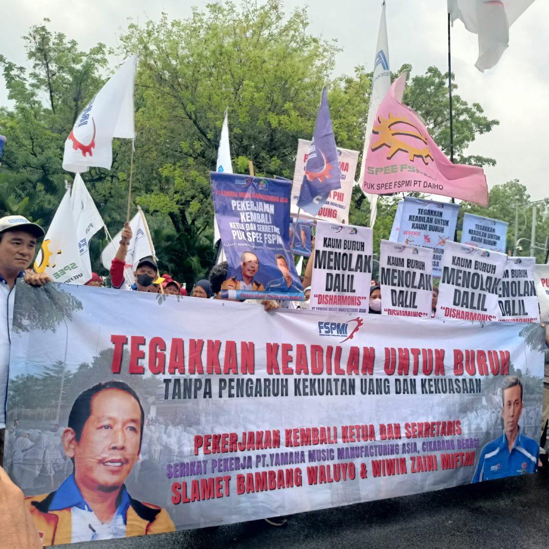 Presiden FSPMI Riden Hatam Aziz menegaskan bahwa aksi ini merupakan tuntutan untuk menegakkan hukum yang sudah jelas mengatur serikat pekerja. “Jika melihat putusan bebas Pengadilan Hubungan Industrial (PHI) Bandung, perusahaan ternyata tidak ada sedikit pun bukti pengeluaran untuk melakukan PHK. Pengadilan Hubungan Industrial telah memutuskan agar dua pengurus serikat ini dipekerjakan kembali,” jelas Riden.